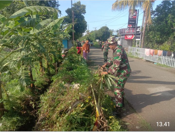Sangat nampak terlihat di lokasi kegiatan para Babinsa bersama warga bahu membahu melaksanakan pembersihan sampah, lumpur dan rumput liar yang menyumbat saluran air.
