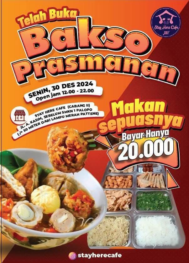 Kini telah dibuka Bakso Prasmanan dengan harga yang muda dijangkau oleh masyarakat berlokasi dinstah here cafe (Cabang II) dijalan A.kasim sebelun SMKN 1 Palopo atau kurang lebih 50 meter dari lampu merah pattene.