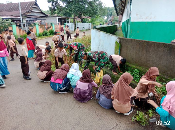 Kapten Inf Ashar, S.Pd Danramil 1426-01/Polut menyampaikan kegiatan ini bertujuan untuk mengajarkan peduli kebersihan sejak dini dan mempererat hubungan tali silaturahmi dan memperkokoh kemanunggalan TNI dengan para Guru dan Siswa SD, “ungkapnya.