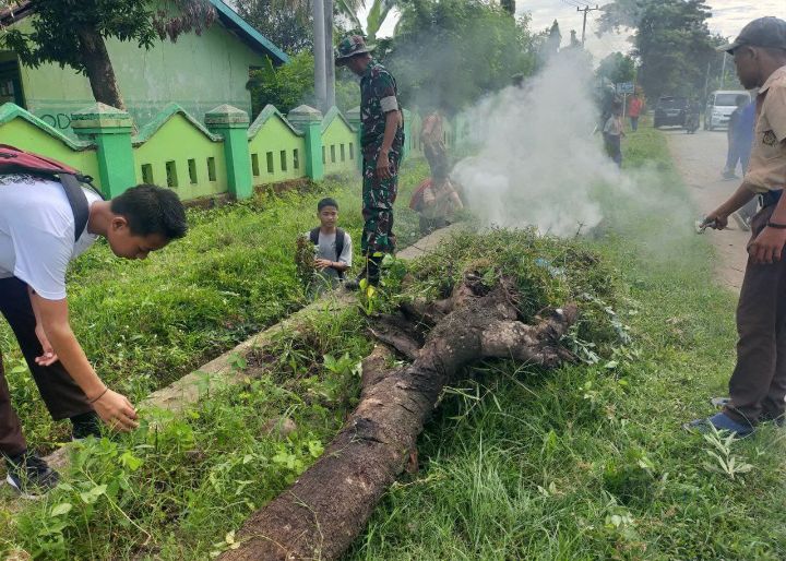 Personel Koramil mengajak warga untuk aktif dan menjadi motivator penggerak masyarakat untuk gotong royong peduli terhadap kebersihan lingkungan. Kegiatan kerja bakti tersebut fokus pada pembersihan bahu jalan yang telah tumbuh rumput liar dan banyak sampah yang mengotori pinggir jalan.