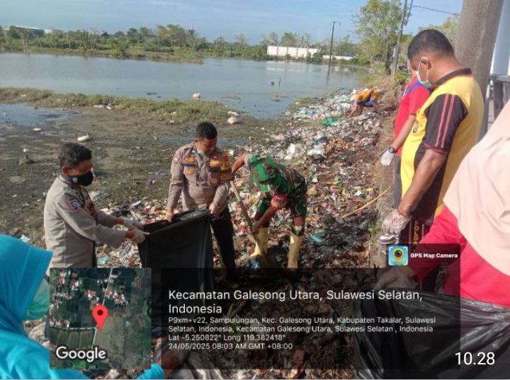 TAKALAR || lmnnews.id-Untuk mewujudkan lingkungan yang bersih, Babinsa Koramil 1426-03/Galut, Kodim 1426/Takalar Desa Sampulungan Sertu Hidayatullah bersama Pemerintah Desa dan warga melaksanakan kerja bakti pembersihan pinggir jalan dari tumpukan sampah di Desa Sampulungan, Kecamatan Galesong Utara, Kabupaten Takalar, Sabtu (24/05/2025).