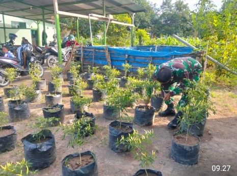 TAKALAR || lmnnews.id-Piket Koramil 1426-07/Pattallassang, Kodim 1426/Takalar, Serka Syarifuddin tampak sedang merawat tanaman yang memanfaatkan lahan kosong dengan menanami tanaman produktif. Pekarangan Kantor Koramil dijadikan lahan pertanian dengan membuat bedengan/rak polibag, dan Kolam ikan yang diisi dengan berbagai jenis tanaman dan ikan. Kamis, (31/07/2025)