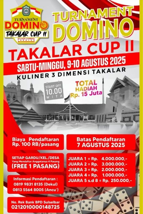 Dengan adanya turnamen domino ini, diharapkan dapat semakin menyemarakkan peringatan HUT RI ke-80 di Kabupaten Takalar dan sekaligus mempromosikan Wisata Kuliner 3 Dimensi sebagai destinasi wisata yang menarik di Sulawesi Selatan. Panitia berharap turnamen ini dapat berjalan dengan lancar dan sukses.
