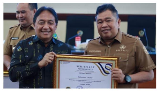 Piagam penghargaan tersebut diterima langsung oleh Bupati Takalar Mohammad Firdaus Daeng Manye, dan diserahkan oleh Bonivasius Prasetya Ichtiarto, Deputi Bidang Pengendalian Penduduk Kementerian Kependudukan dan Pembangunan Keluarga/BKKBN RI.