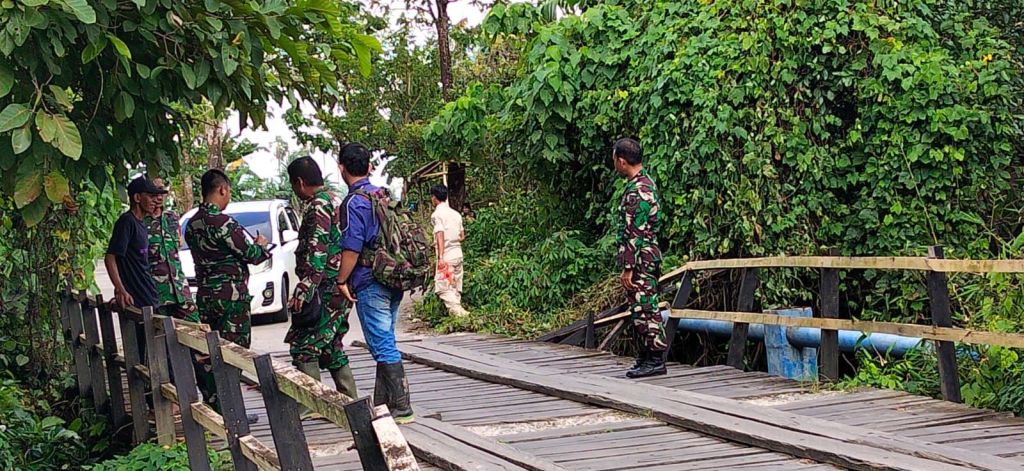 Dilokasi terlihat, Serma Aminullah bersama Anggota Zidam melakukan pengukuran panjang dan lebar jembatan dengan menggunakan alat ukur manual. Sebagian struktur jembatan tampak rapuh dan terbuat dari papan kayu yang sudah menua, berada tepat di atas aliran sungai kecil yang arusnya cukup aktif.