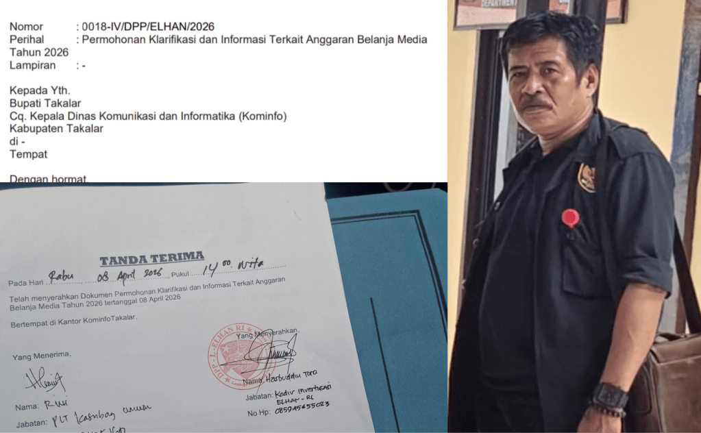 TAKALAR // Lmnnews – Lembaga Elhan Ri resmi mengirimkan surat permohonan informasi dan klarifikasi kepada Pemerintah Kabupaten Takalar, cq. Dinas Komunikasi dan Informatika (Diskominfo). Surat tersebut ditujukan untuk menanyakan detail alokasi dan pengelolaan anggaran belanja media pada Tahun Anggaran 2026.